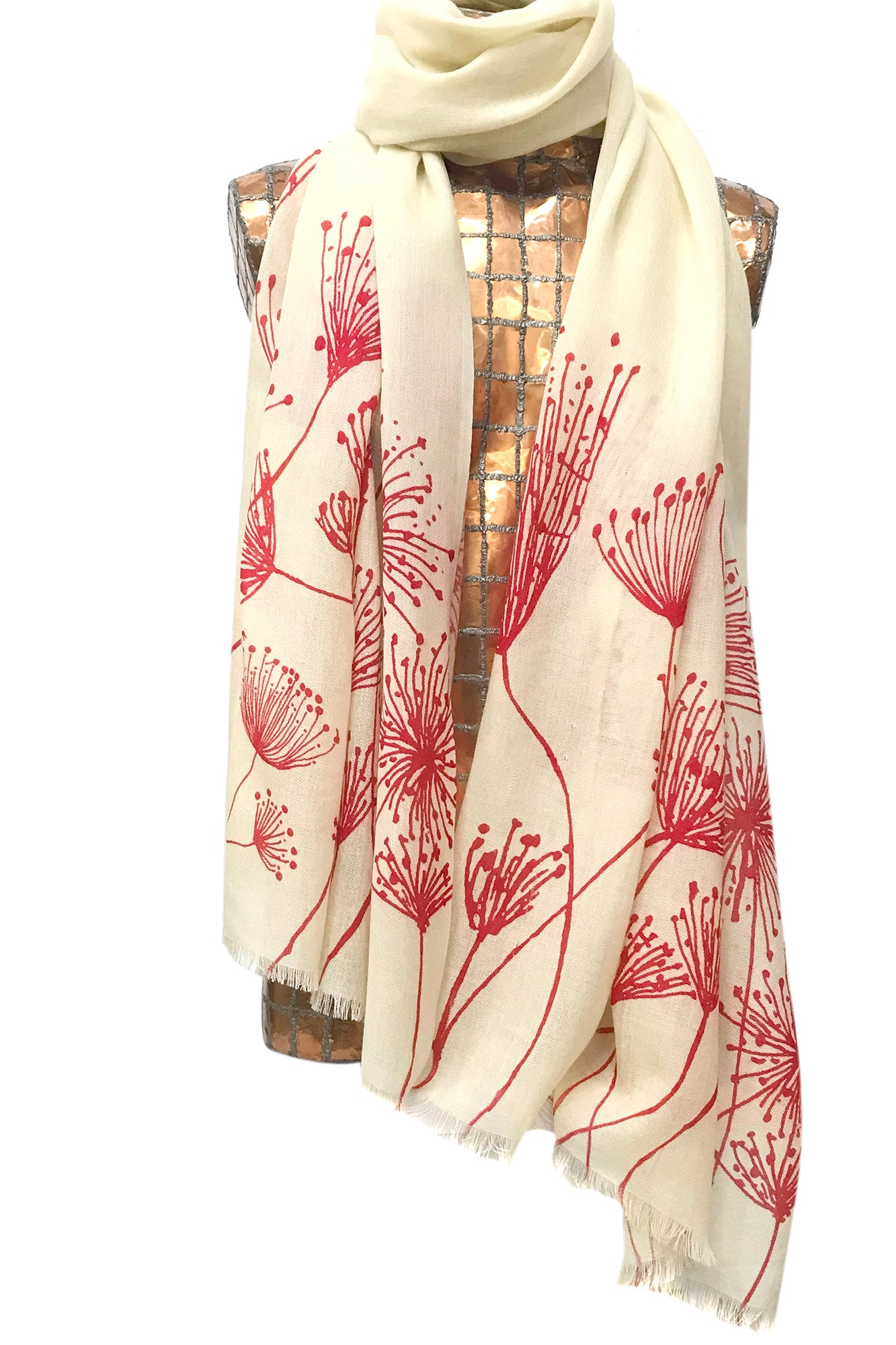 A soft ivory wool cashmere scarf adorned with delicate scarlet dandelion motifs. Lightweight, breathable, and effortlessly elegant, it adds a vibrant pop of colour to any outfit. Perfect for transitional weather and versatile styling—an ideal choice for both gifting and personal wear.