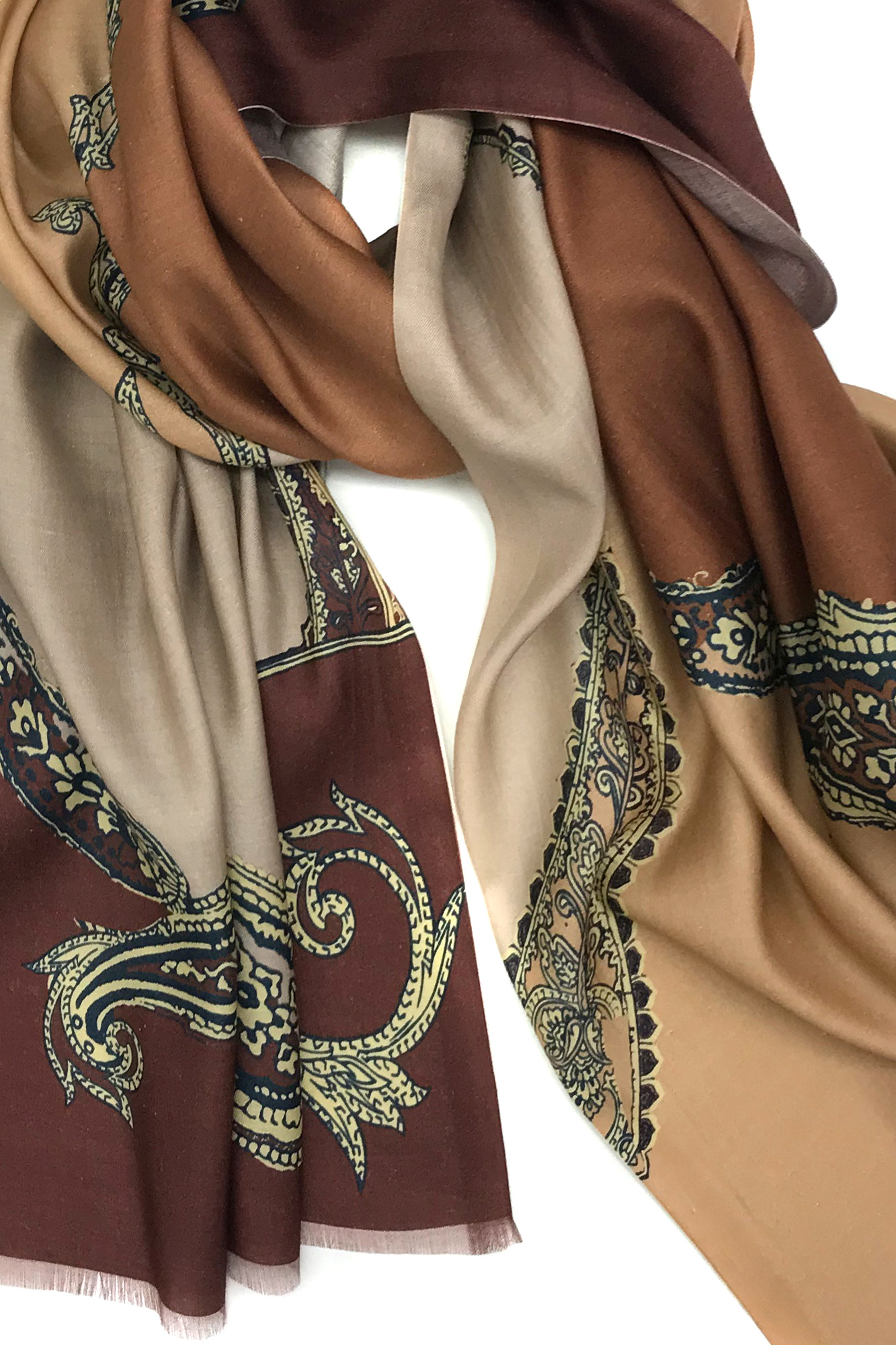 Luxurious raw wool and silk scarf featuring a timeless paisley design. Rich tones of brown and beige create a sophisticated look, perfect for elevating any outfit. Ideal for warmth and style.
