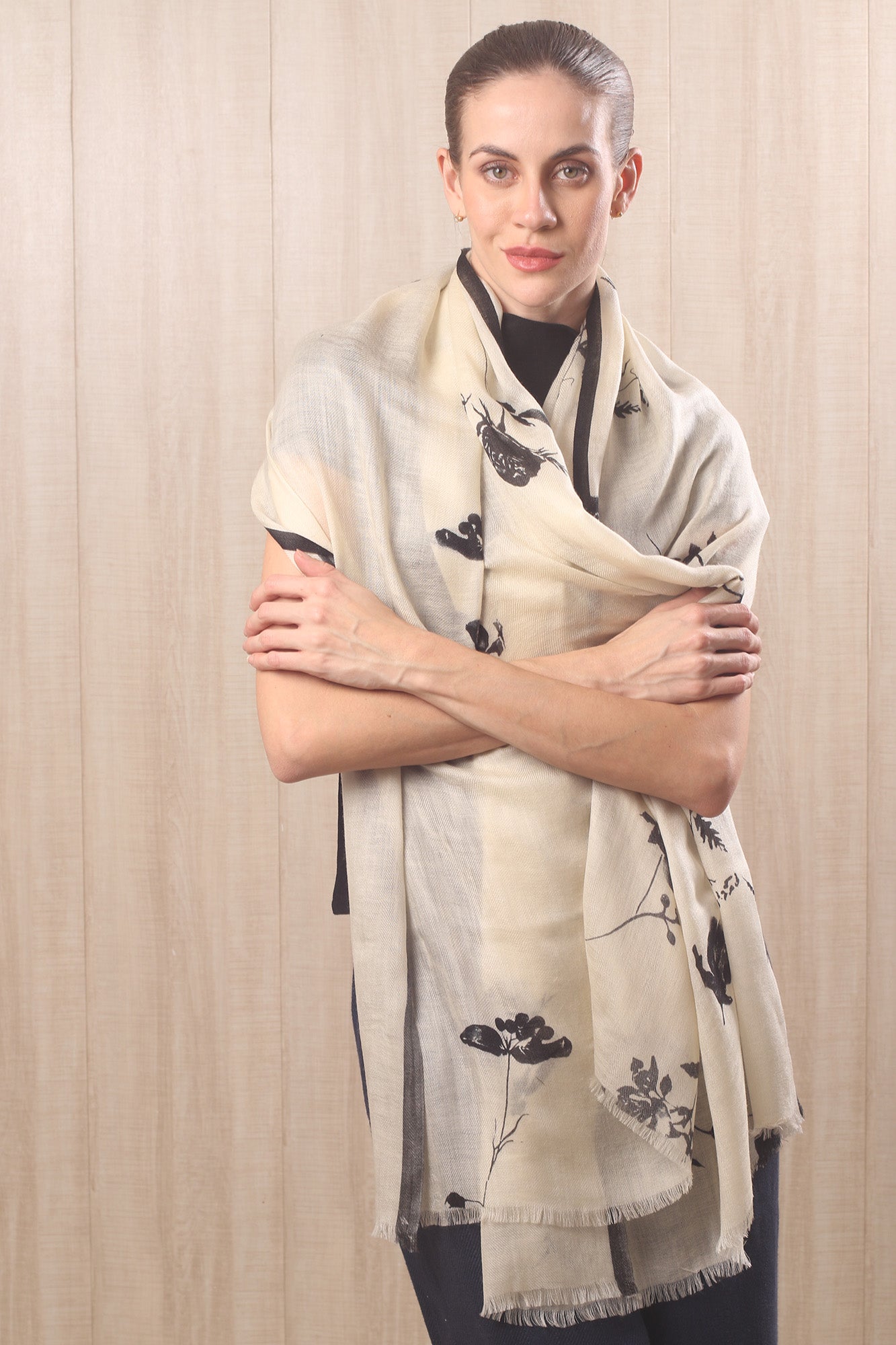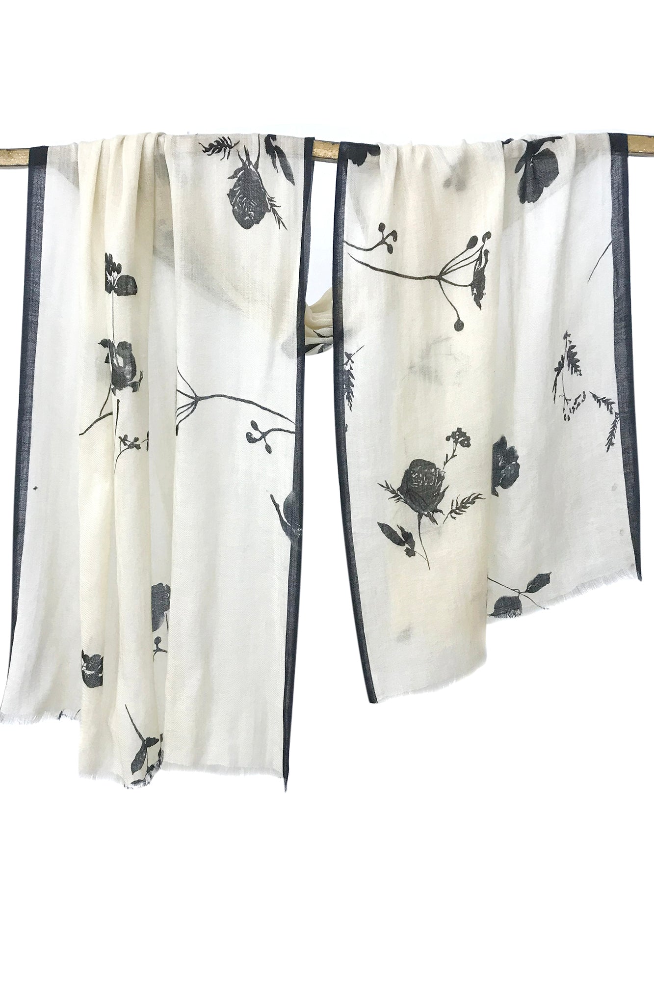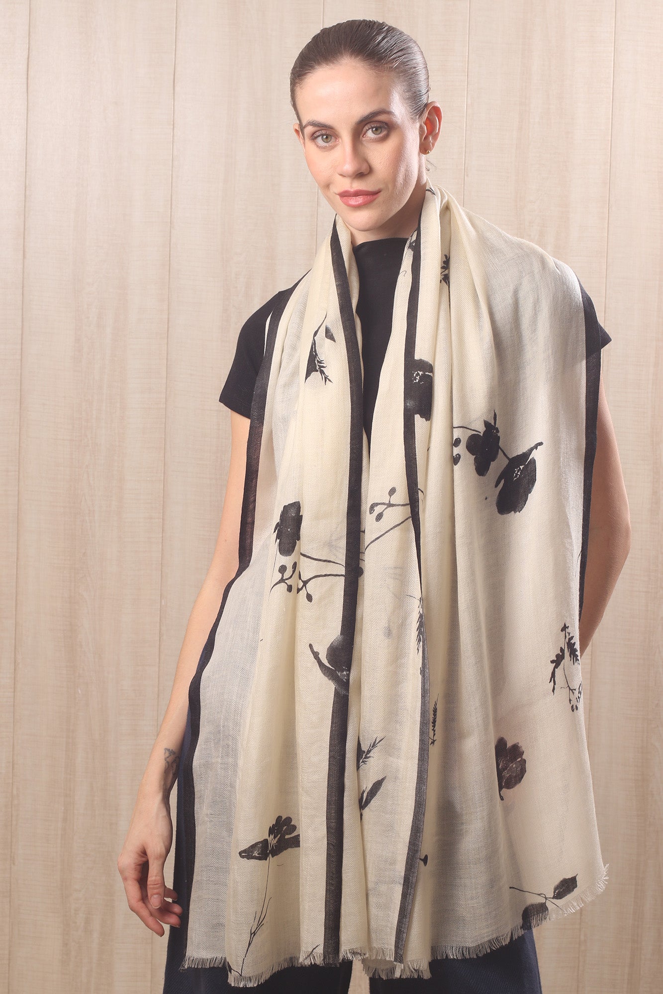 This wool-cashmere scarf features delicate black geranium motifs printed over soft ivory. Light, warm, and refined, it's a timeless accessory that complements both monochrome and tonal outfits with ease.