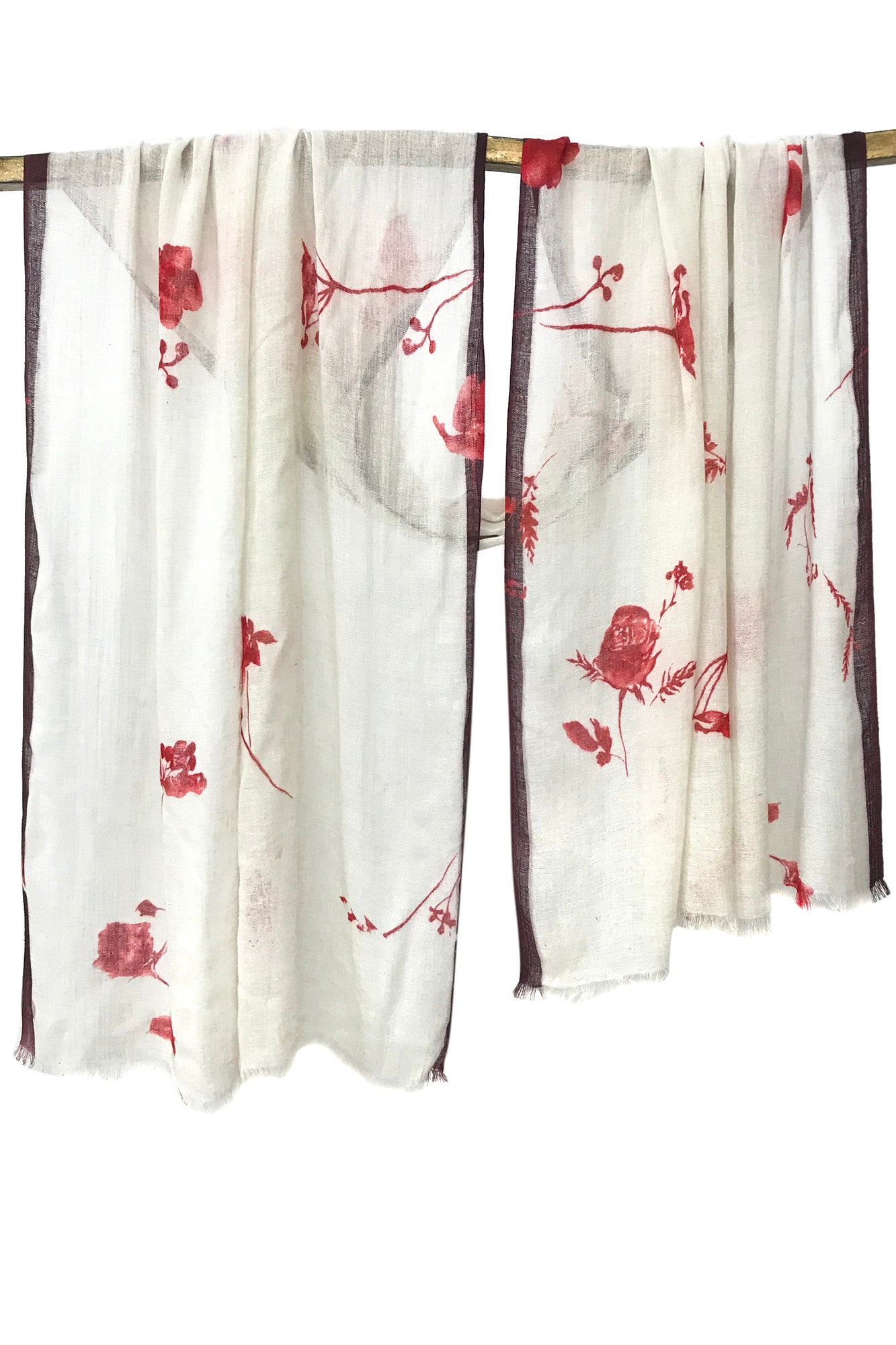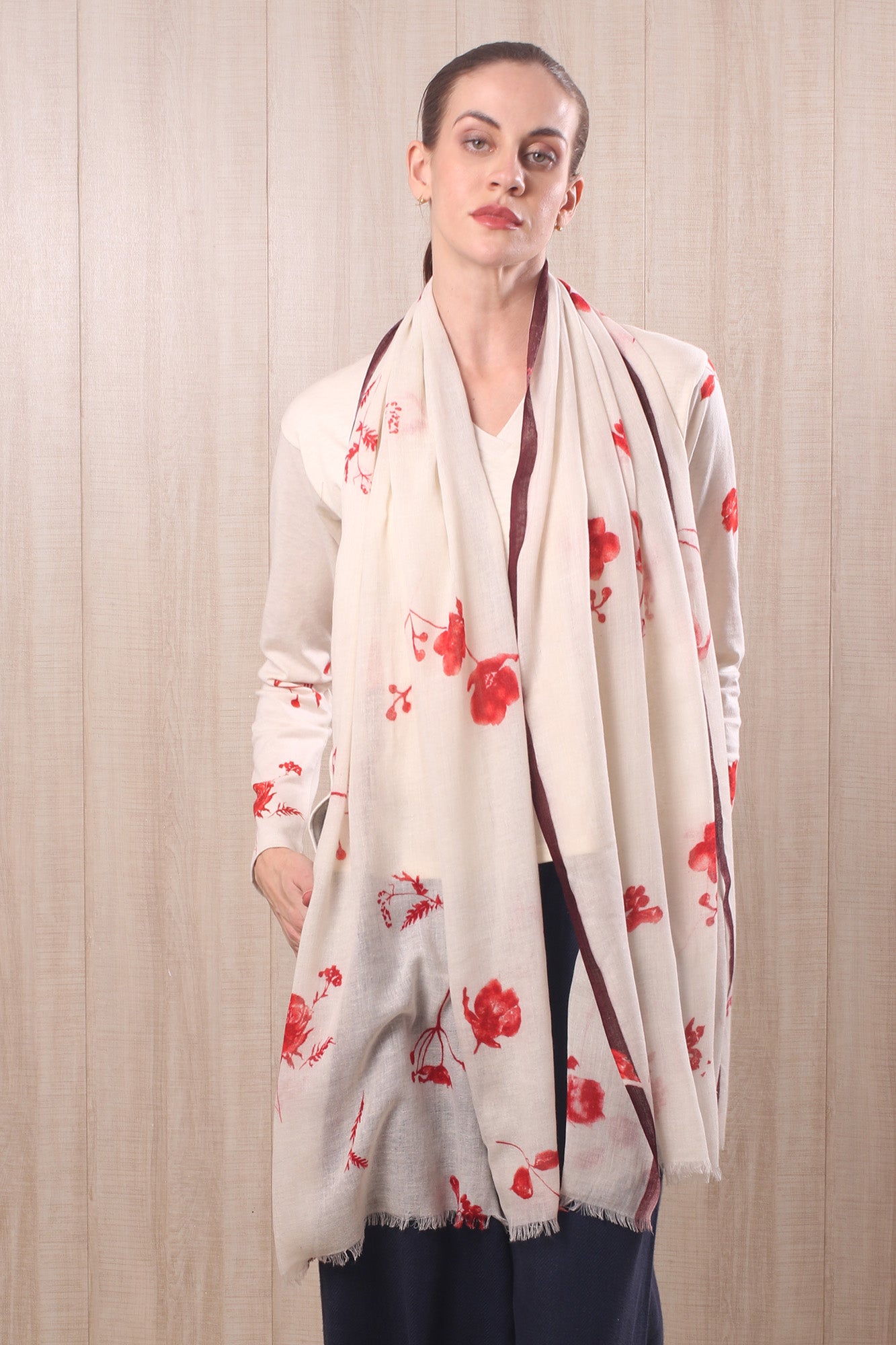 A striking blend of soft ivory and vivid red, this wool-cashmere scarf features delicate geranium motifs. Lightweight yet warm, it adds a refined botanical touch to both daytime and evening looks.