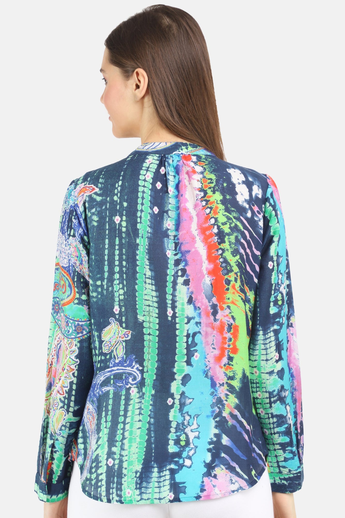 The perfect wear everywhere, paisley printed cotton silk shirt with chineese collar and full sleeves. This shirt makes a great match for grey or white bell pants or even straight pants.