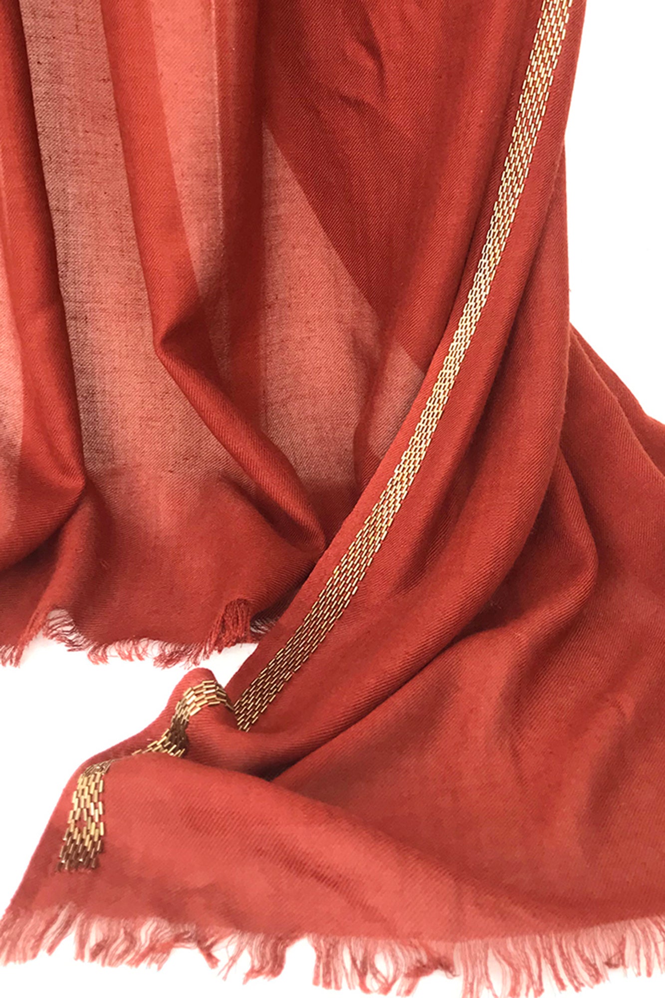 A scarf of pure elegance crafted from pure cashmere, this is a thing of ultimate luxury.The burnt rust paired with the glint of antique gold beads makes for a luxuriously dressy piece.