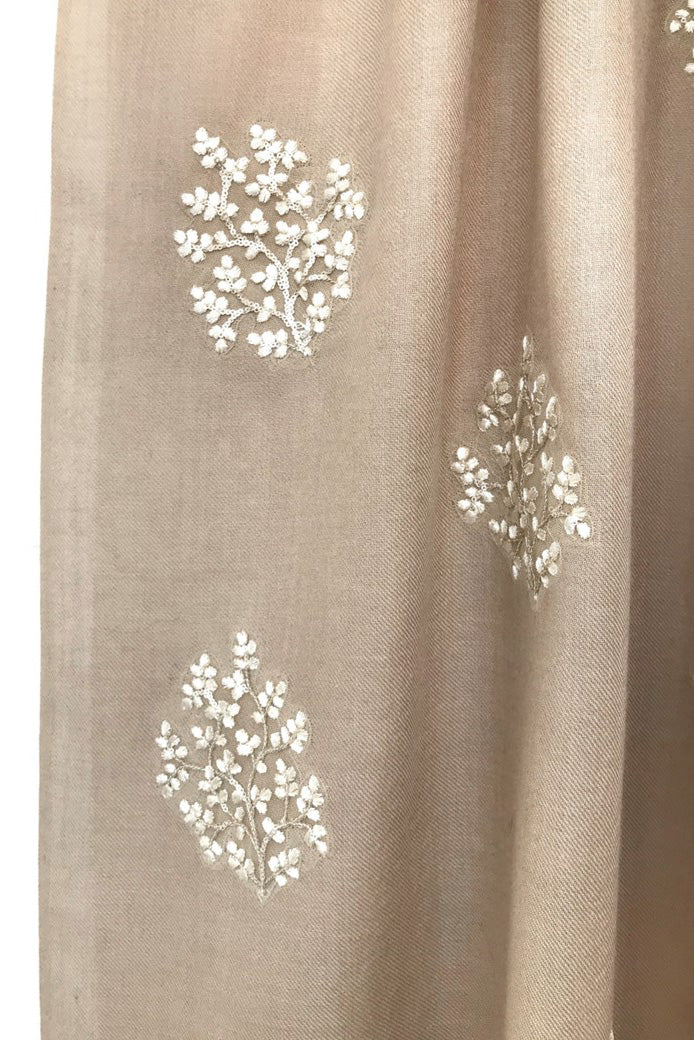 Introducing our opulent beige scarf, intricately embroidered with floral motifs and white beads. Crafted from luxurious silk and cashmere twill, it exudes timeless elegance.
