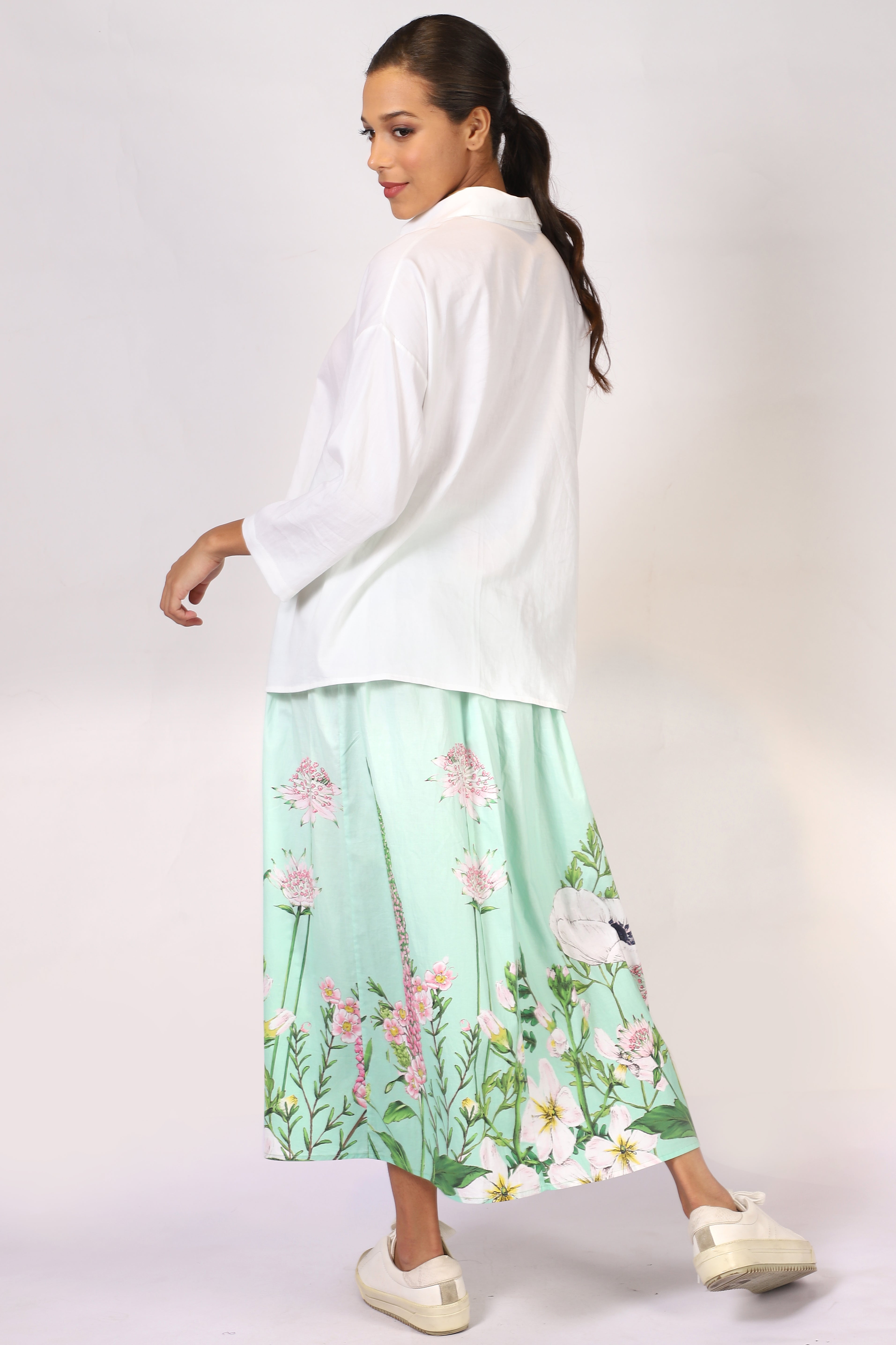 Introducing our luxurious poplin long skirt adorned with a vibrant floral print in shades of light and lush green. Elevate your ensemble with sophistication and elegance, perfect for the discerning individual seeking timeless luxury.
