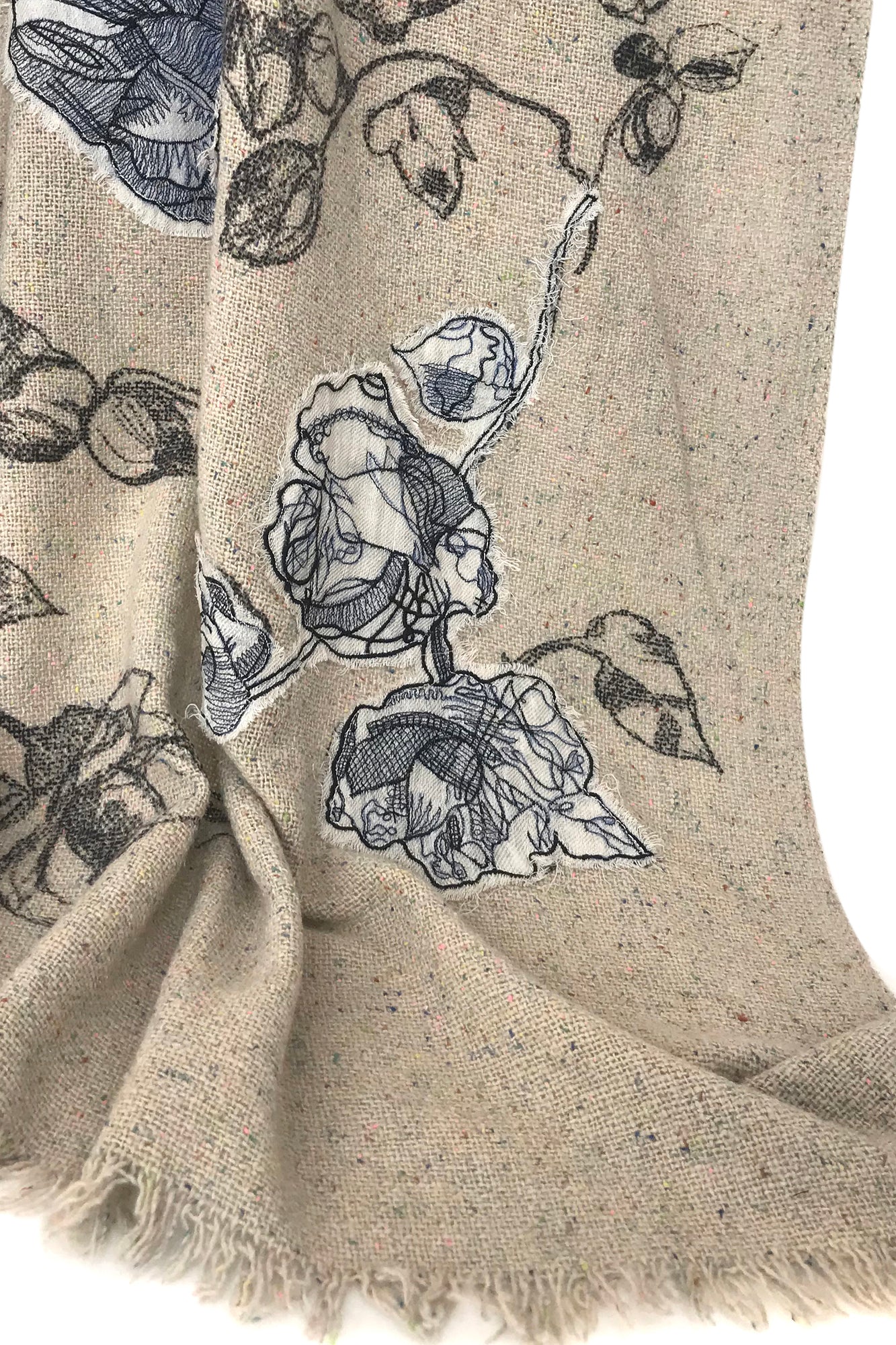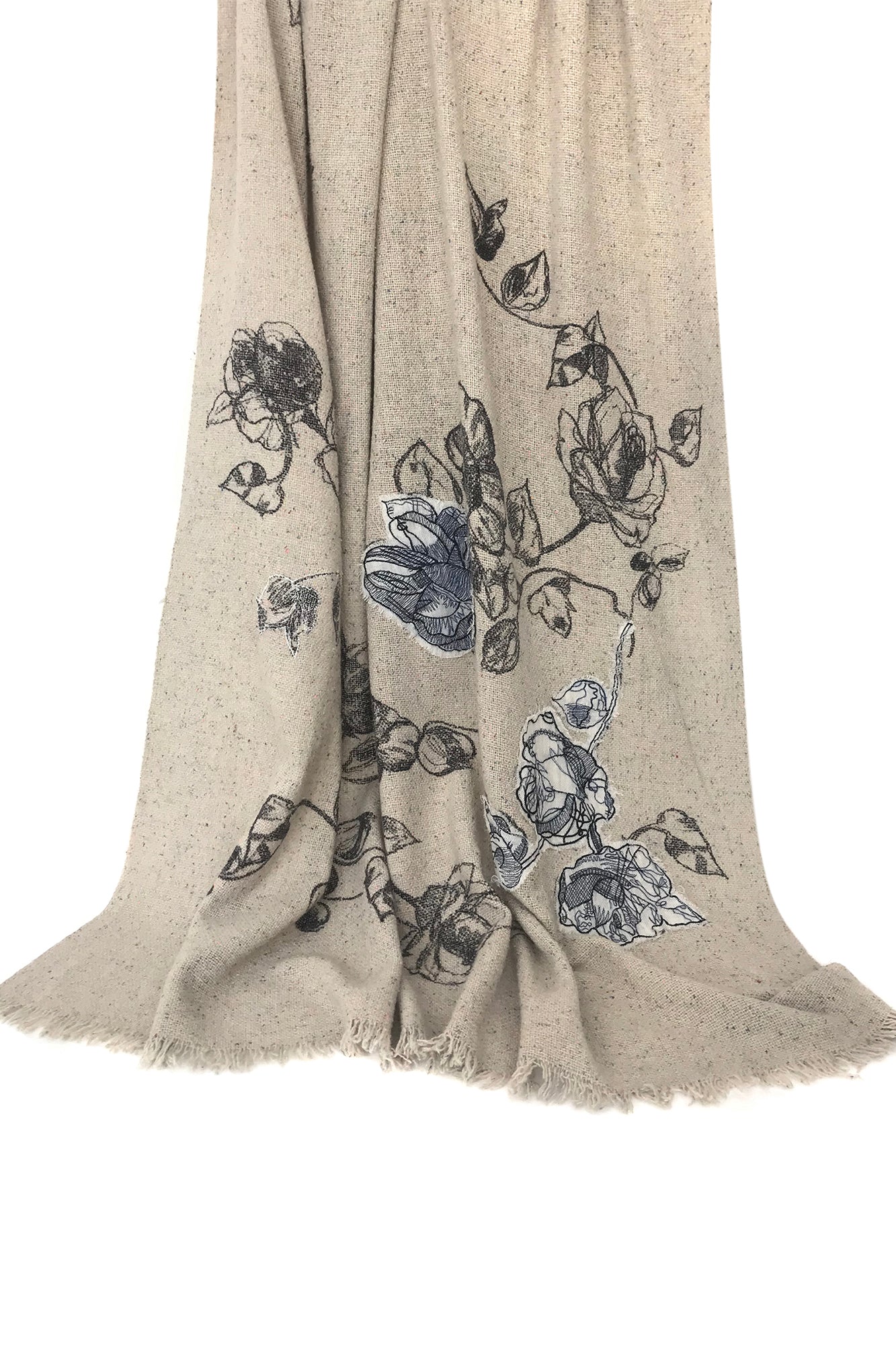 A chunky scarf crafted from the blend of Silk Wool and Cashmere, it is substantial, cozy and warm, the monochromatic floral elements softens the eight of the scarf.