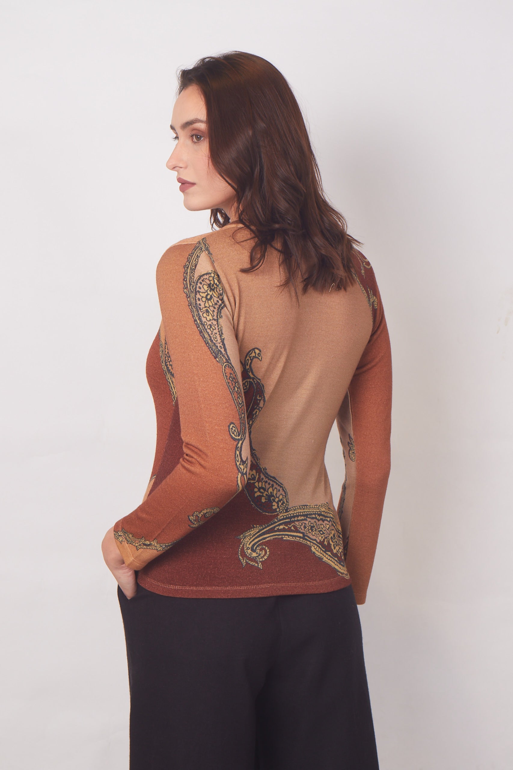The timeless paisley print in warm, earthy tones adds a touch of sophistication to any outfit. Whether paired with jeans for a casual look or dressed up with slacks for the office, this top effortlessly transitions from day to night.