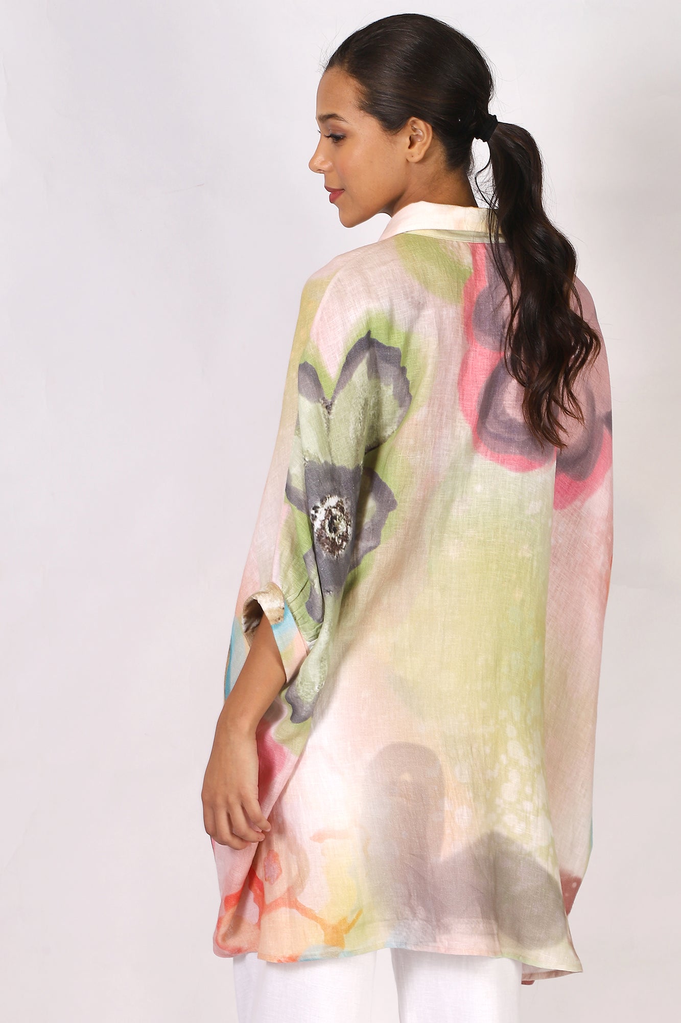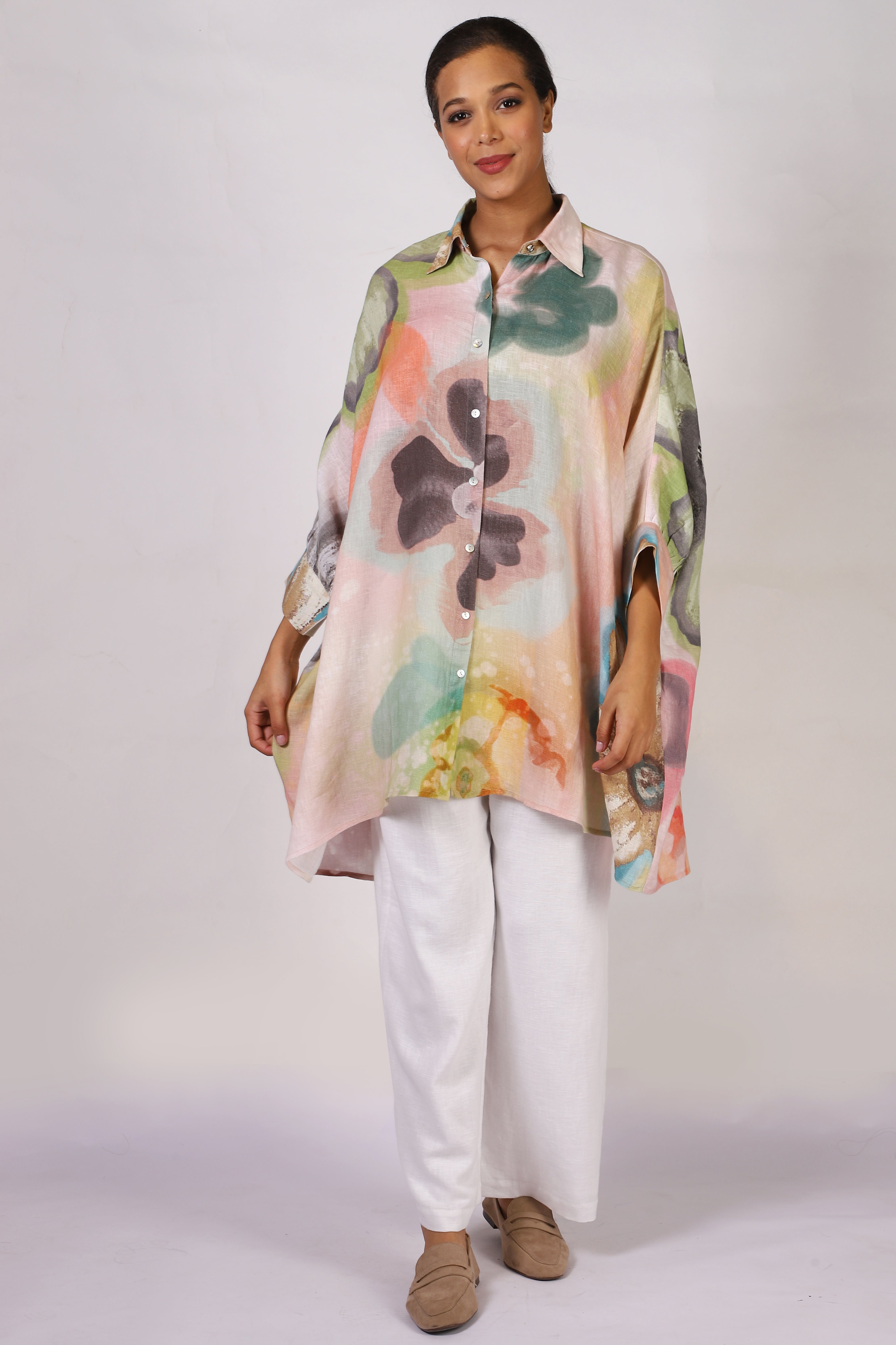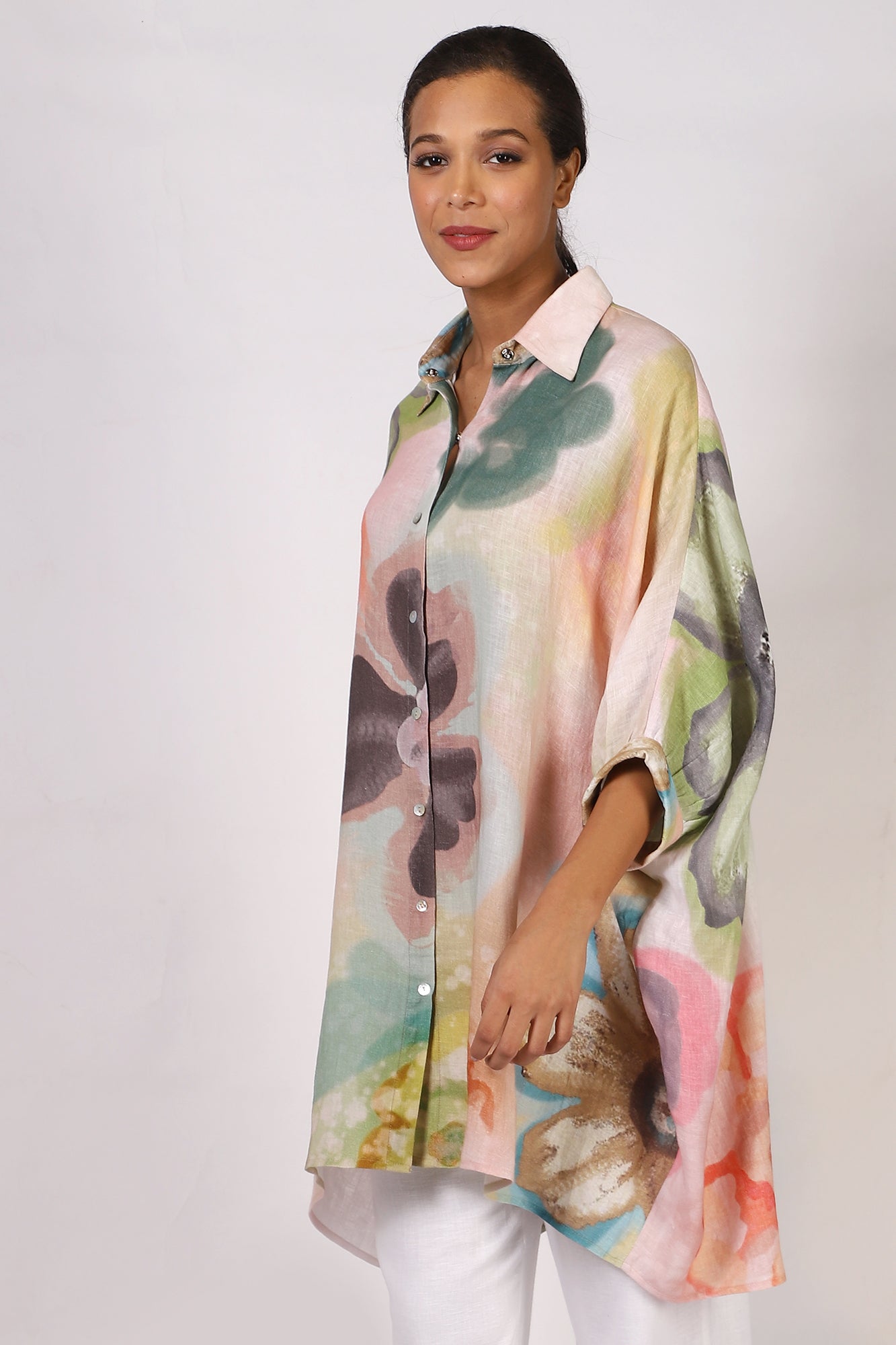 Introducing our luxurious linen shirt tunic with an easy, flowy silhouette. Adorned in a floral pattern of orange, green, and blue, perfect for effortless sophistication,