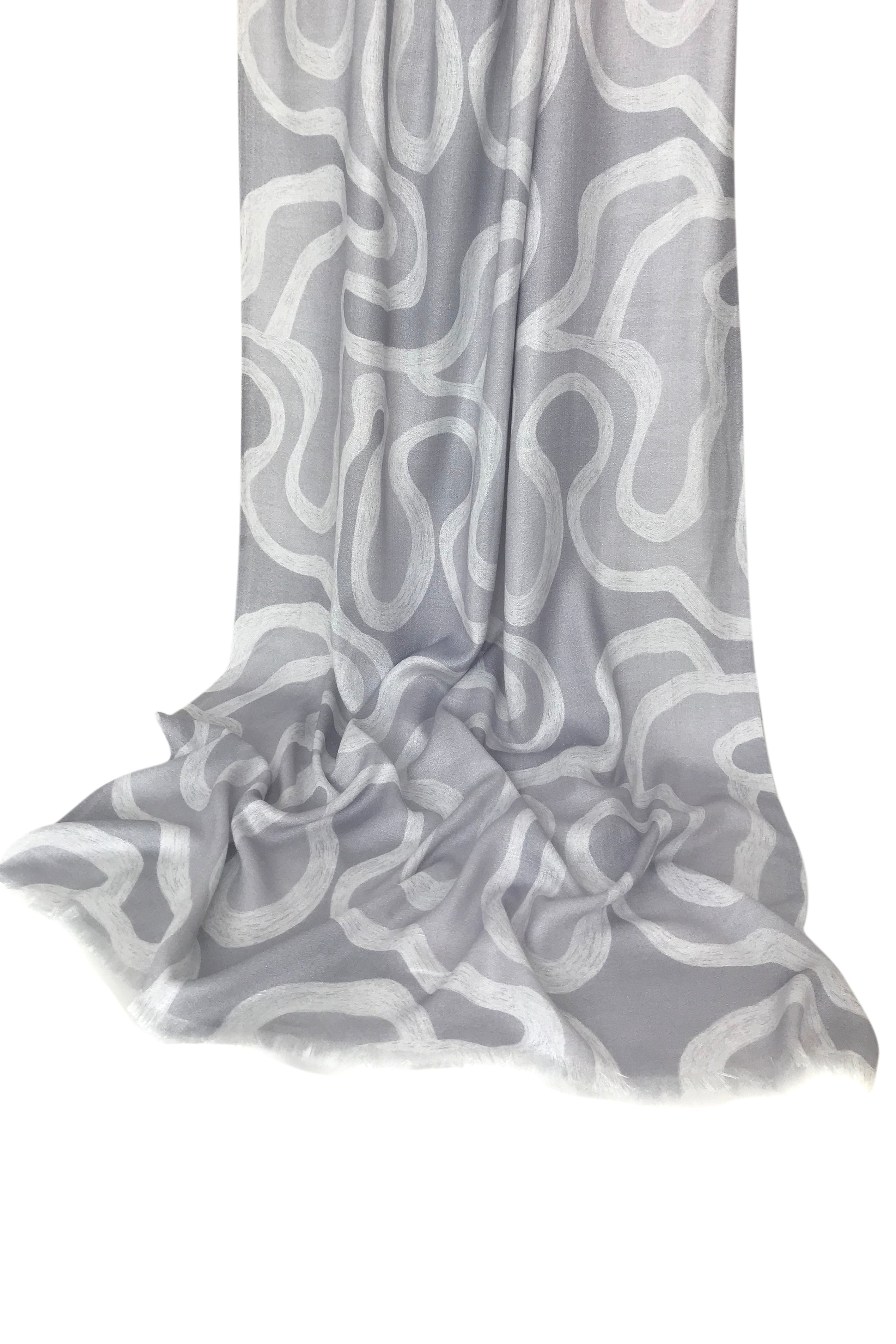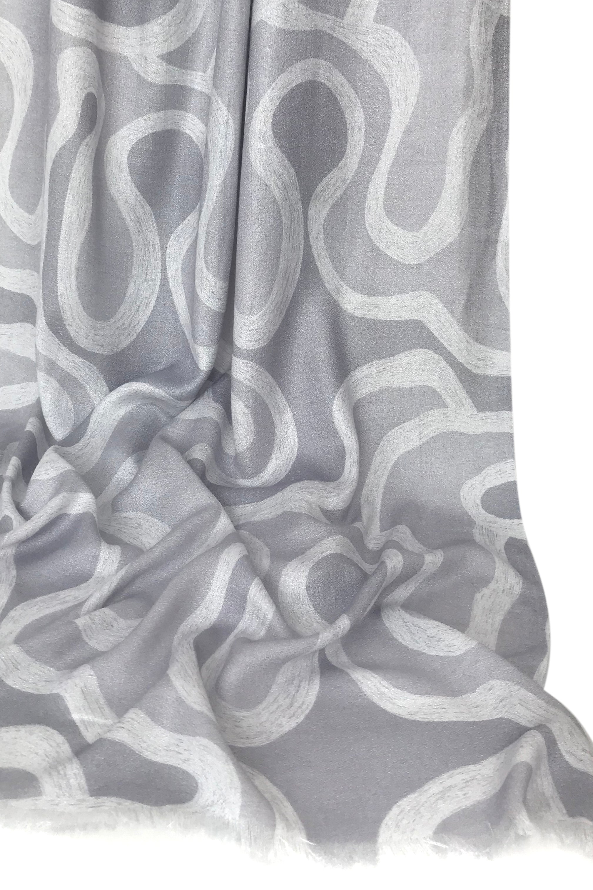 Experience refined luxury with our modal silk wool crepe scarf, featuring an abstract print in sophisticated shades of grey and white. Elevate your ensemble with timeless elegance.