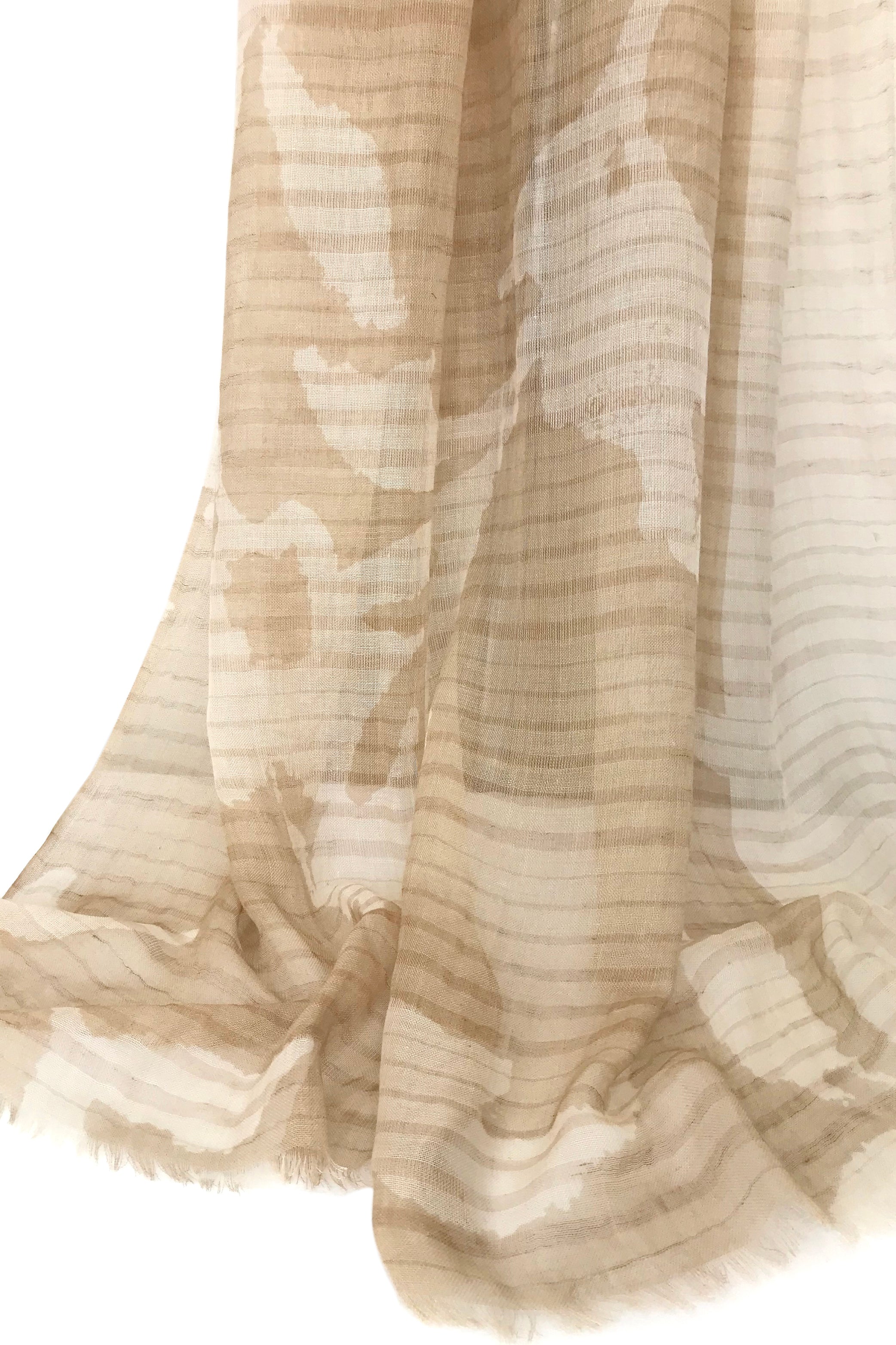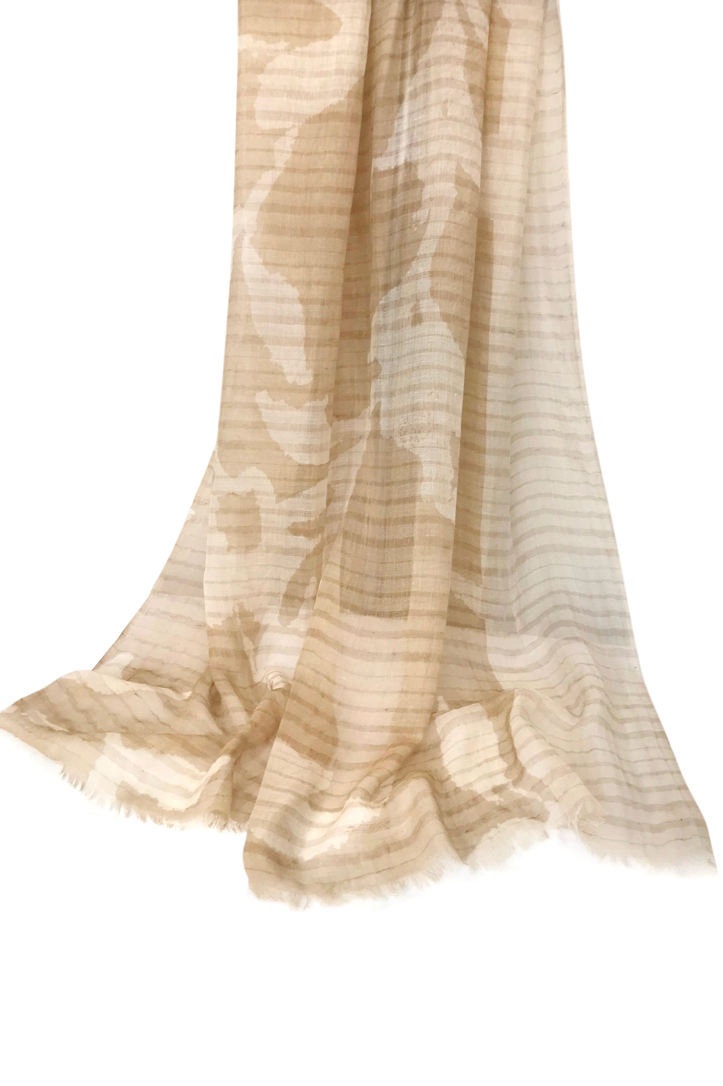 A soft silk-cashmere scarf in beige, with a delicate floral pattern and lightly frayed edges for a touch of simple luxury. The floral design gives the piece and new dynamic and helps it stand out.